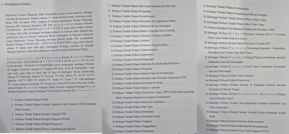 Perkara tanah misalnya yang melibatkan terdakwa Margaretha Makalew, atau Kartini Gaghana yang menyeret Direskrimum Polda Sulut, Kombes Pol Suryadi, SIK. M.H, serta membongkar penyebab kematian Evia Mangolo, Mahasiswi Universitas Manado (Unima), akhir Desember 2025.