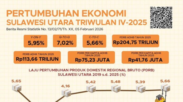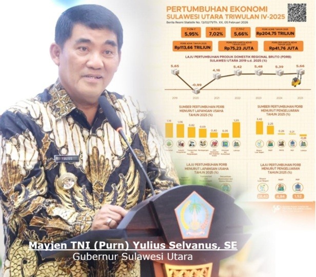 Sementara untuk dasar harga konstan 2010 sebesar Rp 113,66 triliun. Secara kumulatif, ekonomi Sulut tumbuh 5,66 persen (c-to-c) dibanding tahun 2024. Secara agresif, pertumbuhan ekonomi performanya terlihat di akhir tahun. Pada Triwulan IV 2025, ekonomi Sulut tumbuh 5,95 persen (y-on-y).