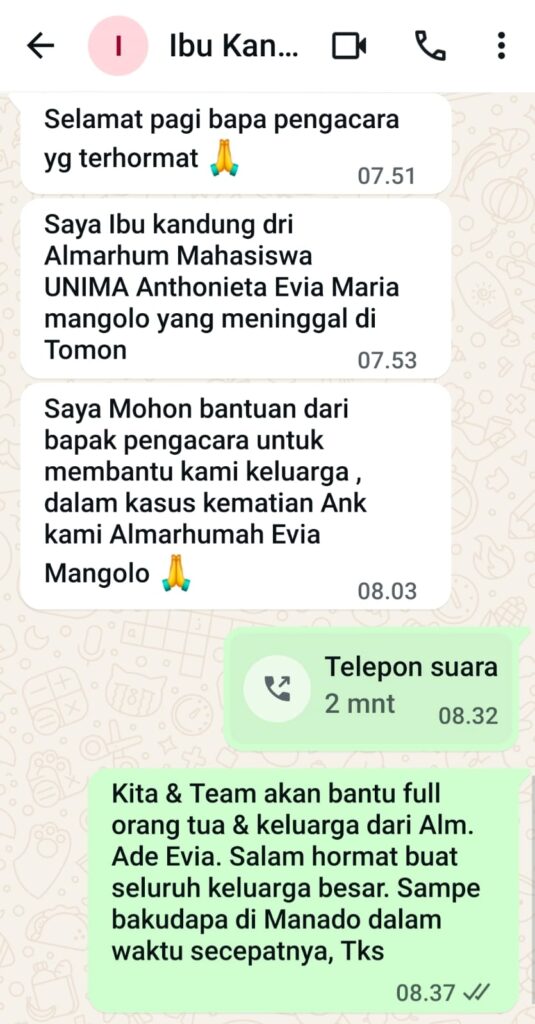 Penegasan itu disampaikan Santrawan, lewat dialog WhatsApp-nya bersama ibunda almarhumah. Santrawan melalui pesannya, menegaskan, dirinya akan mendampingi orang tua Evia dan masyarakat Siau, Tagulandang, Biaro (Sitaro) di Manado, untuk bertemu Kepala Kepolisian Daerah (Kapolda) Sulut, Irjen Pol Roycke Harry Langie.